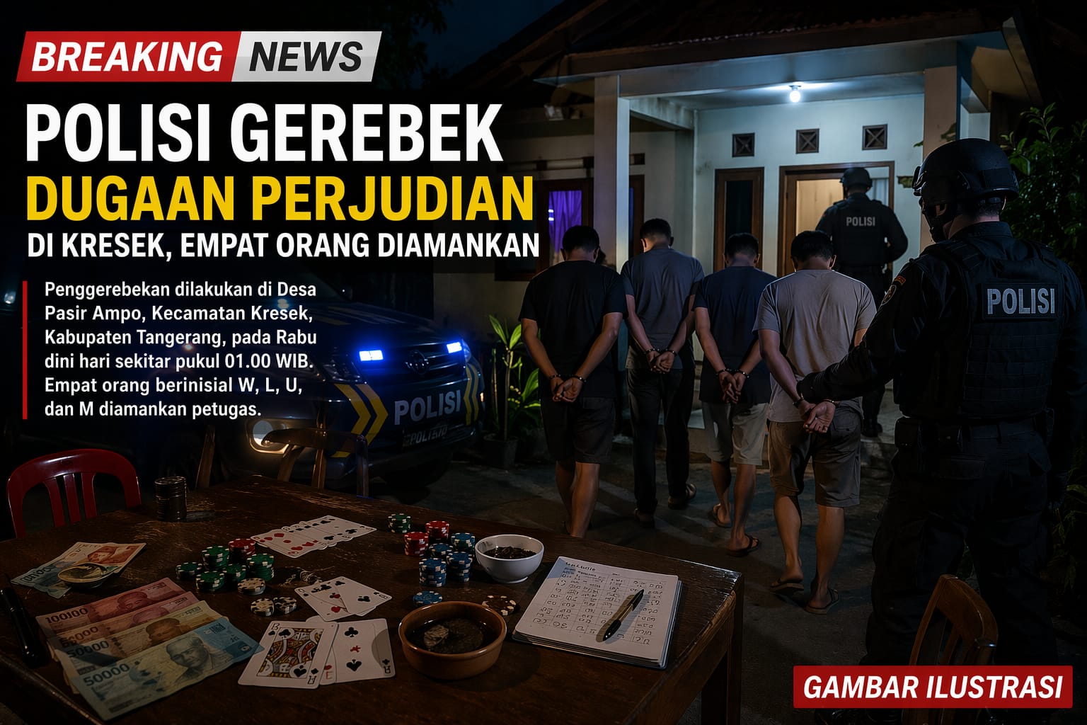 Kabupaten Tangerang, RedOwlNews.Com – Aparat kepolisian menggerebek dugaan praktik perjudian di Desa Pasir Ampo, Kecamatan Kresek, Kabupaten Tangerang, pada Rabu dini hari sekitar pukul 01.00 WIB.