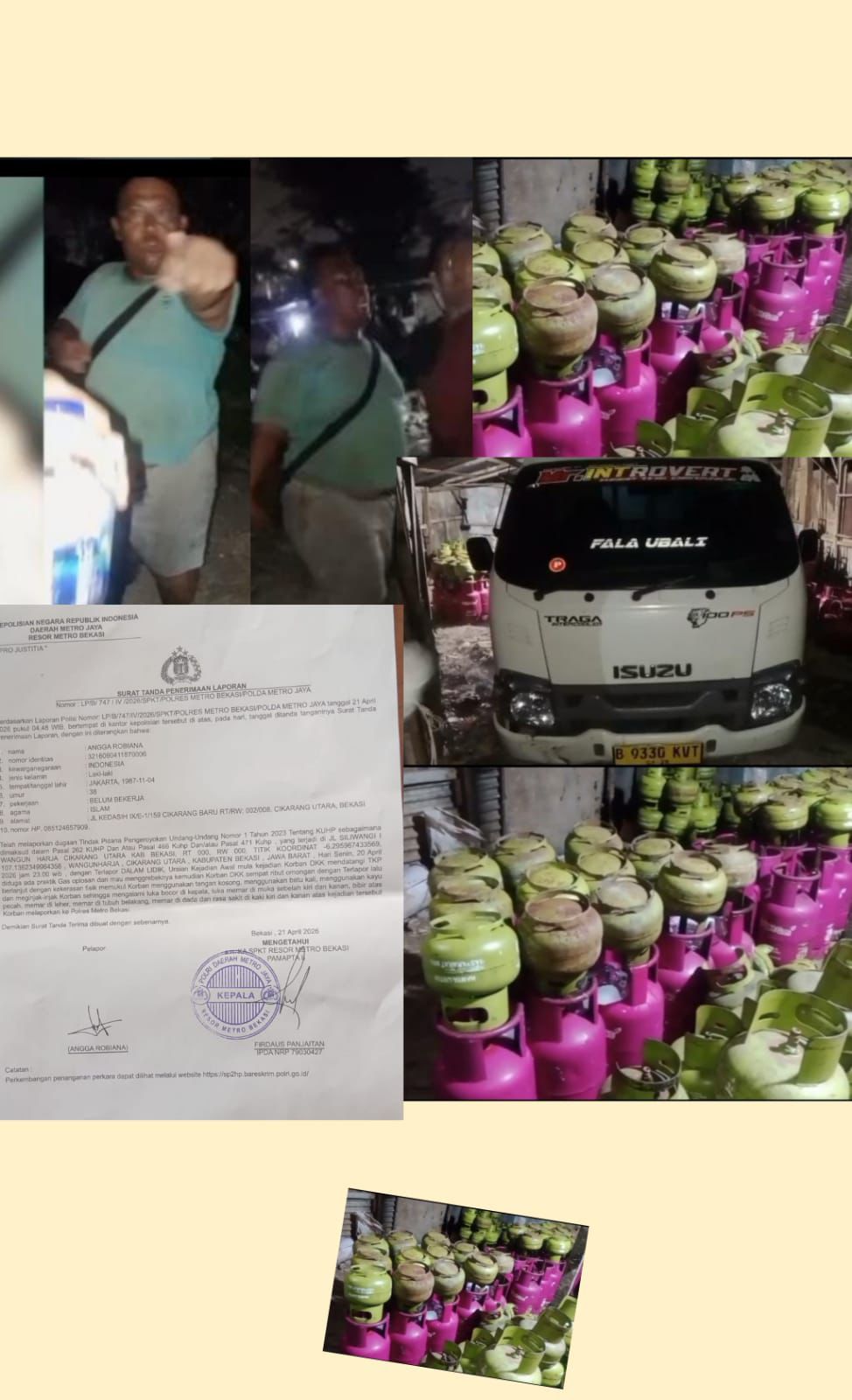 Selain itu, salah satu pelaku juga diduga mengacungkan senjata tajam jenis celurit dan melakukan intimidasi terhadap awak media. Aksi tersebut terekam dalam video yang berhasil diambil sebagai barang bukti, termasuk dokumentasi aktivitas pengoplosan LPG dan sebuah mobil Isuzu bak terbuka dengan nomor polisi B-9330-KVT yang berada di lokasi.