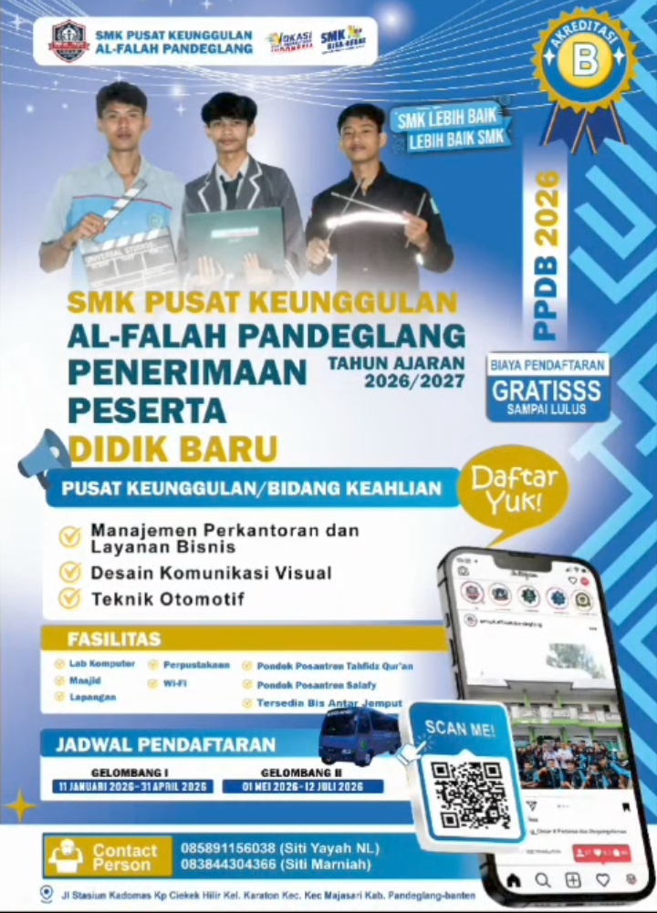 Pandeglang, RedOwlNews.Com – SMK Pusat Keunggulan Al-Falah Pandeglang resmi membuka Penerimaan Peserta Didik Baru (PPDB) untuk Tahun Ajaran 2026/2027. Sekolah yang telah terakreditasi B ini menawarkan berbagai program keahlian unggulan dengan fasilitas lengkap dan biaya pendaftaran yang gratis sampai lulus.